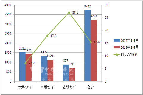 1、2014年1-4月,NG类客车市场增幅均在两位数以上,相对目前比较低迷的客车市场来说,发展势头比较良好。