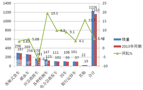 1、按用途种类划分2014年1-5月销量及同比分析---同比增长5.2%,其中各种检测车增幅最大,应急指挥车降幅最大。