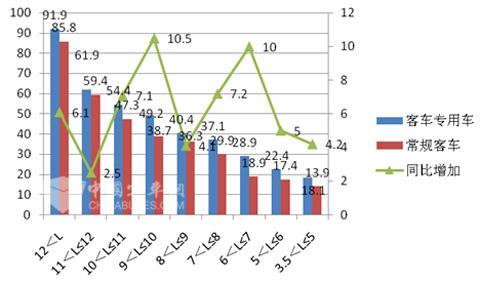 从上图表可以看出:客车专用车单辆平均售价全部在相应区段的常规客车之上。相差的最大比例是9-10米,高出常规车型达10.5万元,其次是6-7米高出常规车型达到10万。