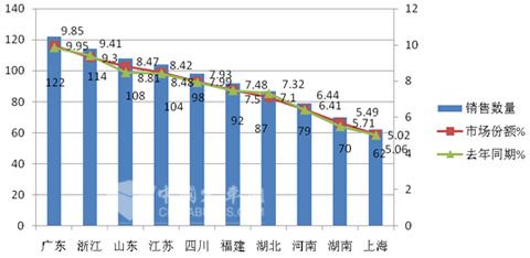 从上表我们可以看出:第一、客车专用车销售的前10名主要是广东、浙江、山东、江苏、四川、福建等区域。最大的是广东市场,占有的市场份额为10.2%.第二、广东等前10名区域市场的集中度为73.99%,垄断程度比较高,全国其他23个区域(省、直辖市、自治区)只占有26.01%的市场份额,说明客车专用车的市场分布式相当不均衡的,这给客车专用车制造企业制定营销策略和投放营销资源提供了有利的市场依据。第三、前10名市场的集中度比去年同期降低了近1个百分点,但广东、江苏、山东、浙江等重点区域的市场份额比去年同期均有所降低。而四川、湖北等却比去年同期有所提高。