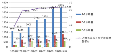 3、近7年来城乡公交市场销量占据当年公交总体市场的份额也在逐年攀升,从2008年1-5月的13.9%稳步上升到2014年1-5月的27.06%,幅度较大。