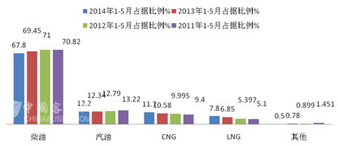 1、在6-8米城乡公交市场中,柴油占据了70%左右的市场份额,而且这种比例有逐年下降的趋势。