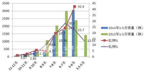 1、2014年1-5月份校车市场的价格链条不是太长,最高区间不过50万。