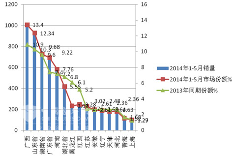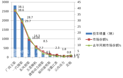 从上图表可以看出:按发动机品牌划分,玉柴发动机是2014年1-5月份校车销量最多的配置,但市场份额比去年同期有所下降;其次是锡柴,比去年同期也有所下降。再次是东风朝柴,也比去年同期有所下降。这一分析,无疑会给客车企业今后在开发校车产品时配置何种动力提供了最有利的市场支持。