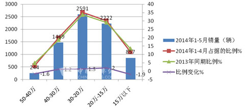 2、销量比例最大的区间是30万-20万,比例占据了35.1%,而2013年同期的比例为33.8%,同比有增大趋势;其次是20万-15万,占据的比例为30.1%,2013年同期为29.1%;销量比例也有增大趋势。