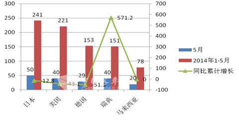 1、进口客车(含轻客)数据分析。2014年1-5月,中国进口客车934辆,同比下降20.1%,进口金额8111万美元,同比增长2.9%。从客车进口国家(地区)来看,2014年1-5月,进口数量最多的国家是日本,数量为241辆客车,同比下降了12.8%;进口金额最大的国家是德国,进口金额为1678万美元,同比增长14.2%;从进口单价上看,进口单车价格最高的国家是马来西亚,单价达到15.0万美元。进口数量和进口金额同比增幅最大的国家是瑞典,分别增长581%和903.1%,进口数量同比下降最多的国家是德国,下降了51.1%;进口金额同比下降最多的国家是美国,下降了43.9%。