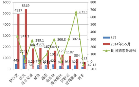 2、出口客车(含轻客)数据分析。2014年1-5月,出口客车29991辆,同比增长45.14%,出口金额9.49亿美元,同比增长34.52%。客车出口国家(地区)来看,2014年1-5月,出口数量最多的国家是埃及,出口客车5369辆,同比增长3。29%。前十位国家(地区)中出口数量和出口金额同比涨幅最大的是玻利维亚,分别增长671.1%和366.40%。