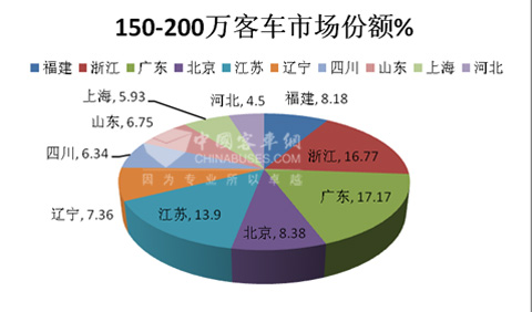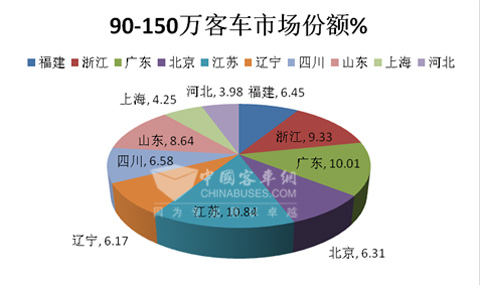 3、从细分市场来看,江苏市场是90-150万价格销量最大的区域,广东是150-200万销量最大的区域,广东也是200万以上客车销量最大的区域。