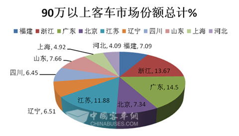5、在2013年上半年,广东区域是90万以上高档客车市场中销量最大的市场,其次是浙江,再次是江苏。