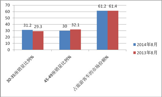 1)2014年8月,在销售的旅游客车2199辆中,30-35座的销售了686辆,45-49座的销售了660辆,两者之和为1346辆,占旅游客车总销量的比例为61.2%;其中30-35座占有的比例为31.2%,45-49座占据的比例为30.0%。2)2014年8月,30-35座与45-49座的销量之和占据2014年8月旅游客车总销量的比例要低出2013年同期近0.2个百分点,说明旅游车向这两个长度段的集中度有一定减弱的趋势。