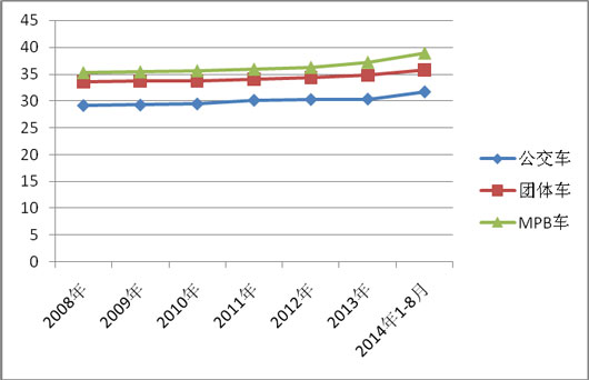 根据有关统计数据获悉(以10米5长度的车型为例来说明),一辆10米5左右的MPB的平均价格一般要比同类型的公交车平均价格要高出6万元左右,比同类型的团体车要高出2万元左右。下表是(以10米5车型为例)统计的2006-2014年1-8月近8年来的MPB、公交车、团体车的平均价(单位:万元)格比较: