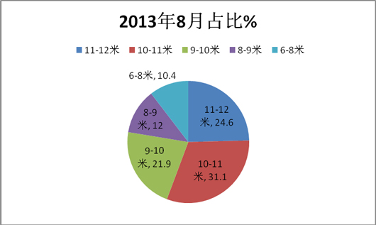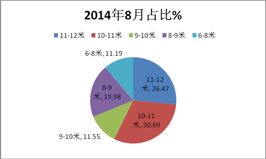 5、按长度段来分析,销量前10名区域市场10-11米团体客车销量最大,占据的比例为30.69%(环比下降了0.81%,2014年7月为31.5%),其次是11-12米长度,占据的比例为26.47%(环比上升了2.07%,2014年7月为24.4%),再次是8-9米占据的比例19.98%(环比下降了2.05%,2014年7月为22.03%),第四是9-10米为11.55%(环比下降了0.85%,2014年7月比例为12.4%),最小的是6-8米,占据的比例为11.19%(环比上升了1.57%,2014年7月为9.62%),各长度段占比同比情况如下图: