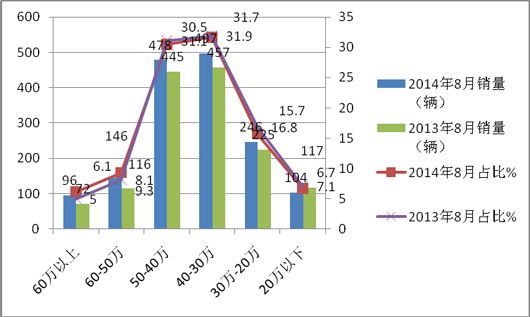 1、2014年8月份60万以上的价格区段的团体车销量和比例最小,但销量和比例同比均增加了,主要原因是2014年8月都是国IV排放了,发动机价格提高。