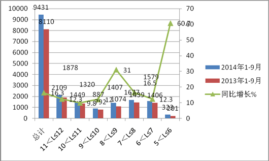 1、2014年1-9月,11-12米CNG客车销量最大,其次是7-8米,最小的是5-6米。
