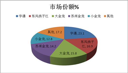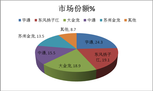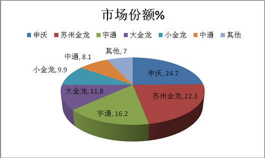 从上图可知,在华东市场,申沃客车占据24.7%的市场份额,其次是苏州金龙客车占22.31%,再次是宇通客车占据16.2%,第四是中通客车占据8.1%,其余品牌占据了7.0%的市场份额,可见上海申沃宇通在华东市场占了地利地位。