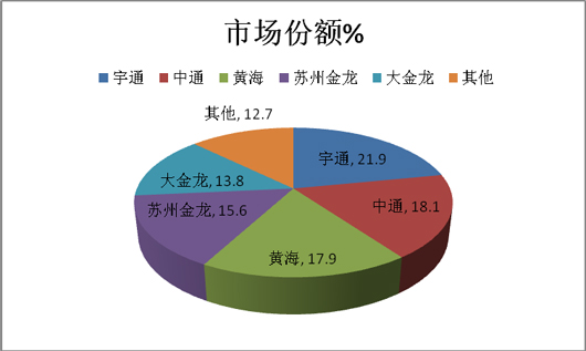 从上图可知,在西北市场,客车老大宇通客车占据21.9%的市场份额,其次是中通客车占18.1%,再次是黄海客车占据17.9%,第四是苏州金龙客车占据15.6%,第五大金龙占据13.8%,其余品牌占据了12.7%的市场份额,可见宇通在西北市场占了地利地位。