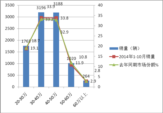 1、2014年1-9月,40-50万和30-40万两价格区间,是CNG客车销量最大的两个主力区段,几乎各占据总体销量的三分之一。其余区间销量较少,销量分布出现了"两头小,中间大"的市场迹象。