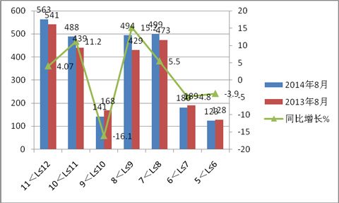 1、大型旅游客车增减情况分析。11-12米大型旅游客车2014年10月销量同比增加4.07%,10-11米同比增加11.2%,9-10米同比减少16.1%,9米以上大型旅游客车共计增加44辆,增加幅度为3.83%。