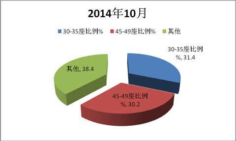 1)2014年10月,在销售的旅游客车2488辆中,30-35座的销售了781辆,45-49座的销售了751辆,两者之和为1532辆,占旅游客车总销量的比例为61.5%;其中30-35座占有的比例为31.4%,45-49座占据的比例为30.2%。2)2014年10月,30-35座与45-49座的销量之和占据2014年10月旅游客车总销量的比例要高出2013年同期近2个百分点,说明旅游车向这两个长度段的集中度有一定增加的趋势。