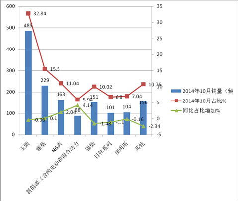 五、新能源客车走进团体客车车型的趋势正在加强---按动力种类划分对2014年10月团体客车销量占比及同比分析