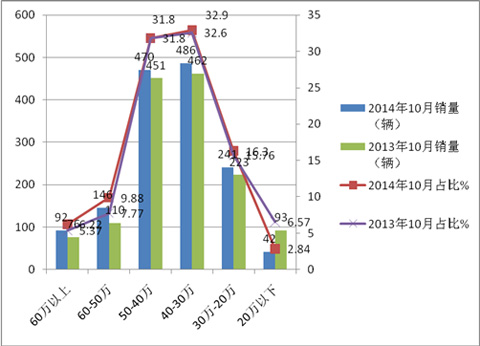 5、通过上述分析,很明显,2014年10月份团体客车高端和低端两个价格区间的产品销量占比较小,而中间段的价格占据主体部分。