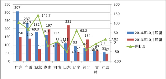 根据上牌数据,2014年10月份销量前6家主流客车企业在前8个重点区域的销量分布情况统计表