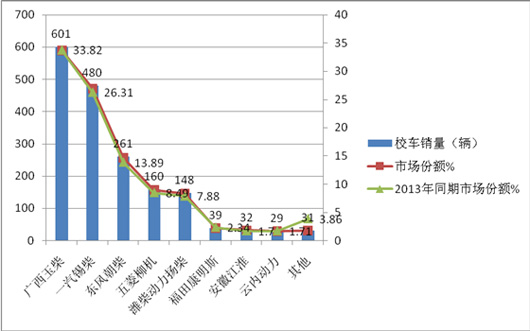 从上图表可以看出:按发动机品牌划分,玉柴发动机是2014年10月份校车销量最多的配置,其次是锡柴。再次是东风朝柴。同比可知,玉柴、锡柴及东风朝柴这三个前三名的品牌市场份额几乎变化不大,基本均衡销售。