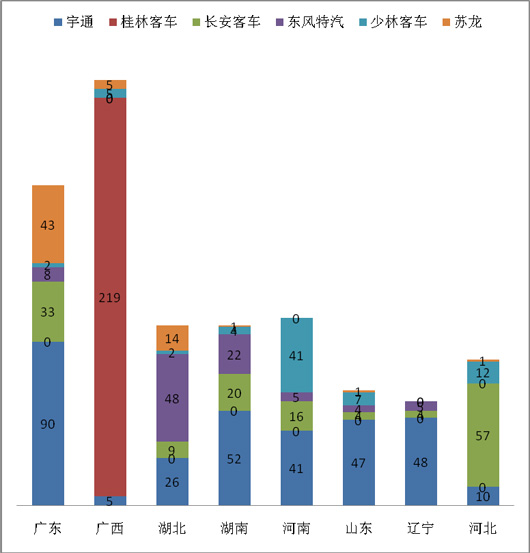 2、销量第二的广西区域主要是属地企业桂林客车的市场,桂林客车占据了92.4%的市场份额,前6名占据了98.73%的市场份额。