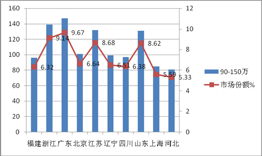5、山东是高端客车市场需求量第四大的区域市场,整体集中度为8.61%.具体为:对价格在90-150万区段的需求的集中度是8.62%,对价格在150-200万的区段的需求的集中度为8.45%,对价格在200万以上的区段的需求的集中度是8.85%,.也就是说,在山东区域市场,价格在90-150万集中度次小,150-200万区间的产品市场集中度最小,200万以上最大,但市场份额仍然不小,因此,高端客车生产企业对山东区域的营销策略也不容忽视,因为该区域对高端客车市场需求的机会也不小,主要因为山东是沿海发达的区域之一,青岛、威海、烟台等旅游市场也很发达,无疑拉动了对高端客车市场的需求.