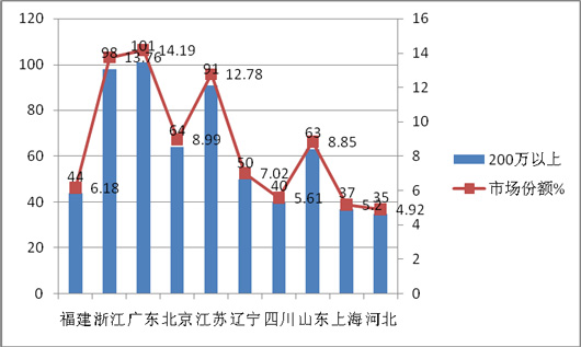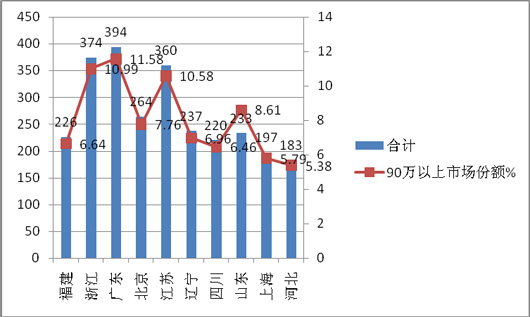 1、福建、浙江、广东、北京、江苏等10个区域市场是90万以上高档客车市场需求的主要市场,集中度比较高。需求比例占整个高档客车市场的80.75%,其他区域市场销售高端客车只有近19%的市场机会。在90-150万的价格区间,集中度为72.88%;150-200万的价格区间的集中度为86.83%;200万以上的集中最高度为87.5%。也就是说,90万以上高档客车在200万以上区间集中度最高,90-150万集中度最低,即随着价格的升高,集中度也在升高,集中度与价格成正比。