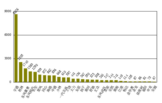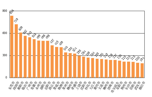 从分区县视角看(请见图7),深圳市福田区以719辆位于2014年5米以上校车县区注册量首位,广州市越秀区、上饶市信州区、九江市浔阳区、株洲市攸县、济南章丘、东莞市南城街道以及衡阳市衡阳县分别位于5米以上校车注册量第二至第八位。分区县的分析结果能够为区域销售决策提供更为深入直接的分析结果,从而使得客车企业能够更准确地掌握校车市场微观区域及周边的需求动态。