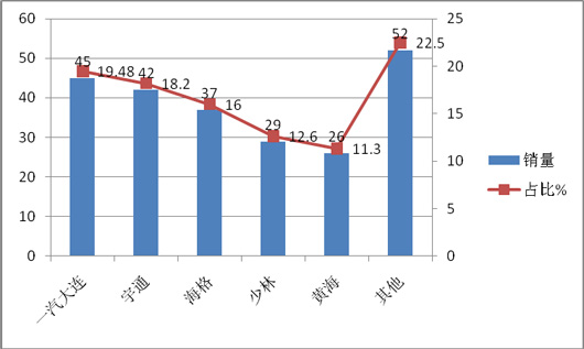 2、同比可知,低档CNG市场份额有减少的趋势,高档市场份额也有减少的趋势,中档市场份额相对较稳定。这给生产销售CNG客车产品的企业在今后制定价格策略是提供了较重要的量化依据。