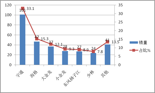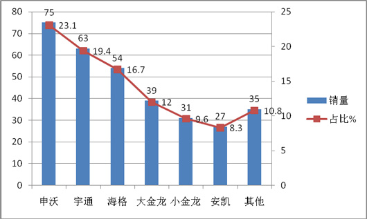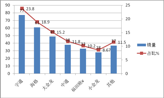 上牌信息显示,2015年1~2月北京、山西等区域共计销售CNG客车323辆,同比增幅11.4%,山西省销售最多,达110辆,为华北市场中最大。从车型看,大型客车为主流,销售129辆,占据的权重为44.5%,为最大。共有13家企业的CNG客车在华北区域发生销售,宇通居首位,销量在77辆,占据近23.8%的市场份额,其次是海格客车18.9%的市场份额,再次是大金龙15.2%的市场份额,第四、第五、第六分别是中通、福田欧V,小金龙,可见,华北区域CNG客车市场是三龙两通及属地企业福田欧V的天下。