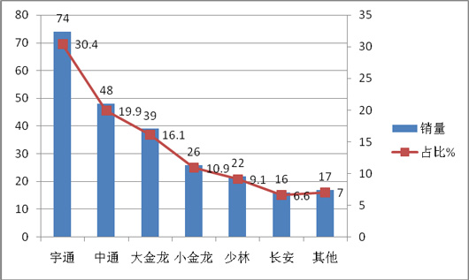 上牌数据显示,2015年1~2月辽宁、吉林、黑龙江等区域市场共计销售CNG客车231辆,同比增长16.1%,吉林省销售最多,达到109辆;从车型看,大中型客车为主流,中型客车销量89辆,占据44.7%的权重有11个品牌的CNG客车在东北区域发生销售,前五家企业依次是一汽大连、宇通客车、苏州金龙、河南少林、黄海,其余企业销量都不多。一汽大连客车厂由于有地域优势,前2个月销售45辆,占据近19.48%的市场份额,其次是宇通客车占据18.2%的市场比例,再次是海格客车占据16.0%的市场比例,第四是少林客车占据12.6%的市场比例,第五是东北本地企业黄海客车占据11.3%的市场比例。