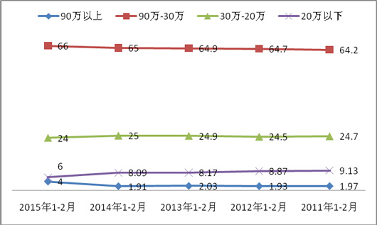 2015年1-2月及近4年同期大中客市场按价格划分销量比例(%)表