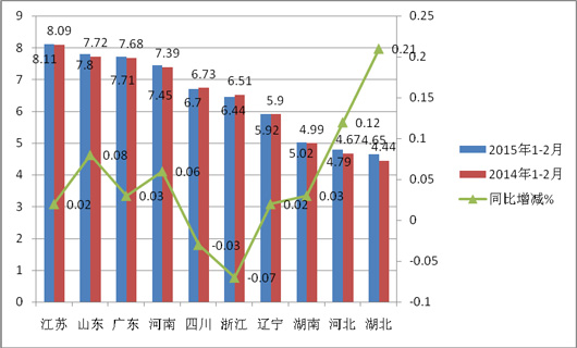2、销量前10名主流区域市场的中档客车市场份额总和为64.59%,比2014年同期的64.12%增加了0.47个百分点,由此可以判断,2015前两个月中高档客车市场流向重点区域市场的趋势在加强,反过来说,全国其他20多个区域市场的中档客车的市场集中度必然呈现减弱趋势。
