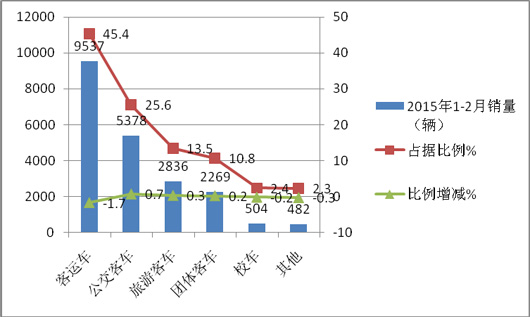 按用途划分2015年1-2月与去年同期比中档客车在各细分市场的销量结构统计表