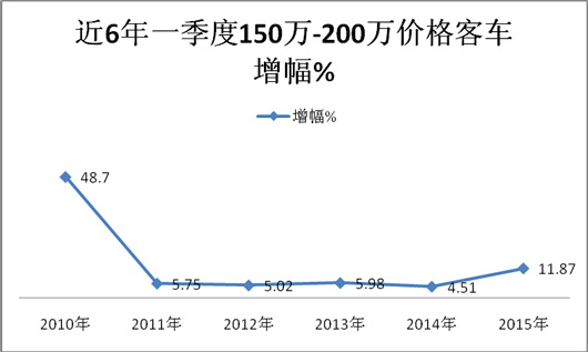 从上图表看出:150-200万价格的客车近6年一季度也一直处于增长态势,但除了2010年增长幅度较大外,2011年到2014年3年增幅均在个位数,并且在5%左右徘徊,但到了2015年增幅增加到11.87%,达到两位数,这一规律与90-150万价格区间的规律相似。