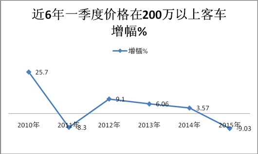 3、通过表一可以看出,2010年1—3月份到2015年1-3月份,从价格在200万以上的销售情况分析可知,近6年同比增幅有正有负,与90-150万和150-200万两个价格区间的客车市场规律有所不同。