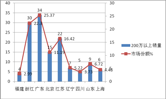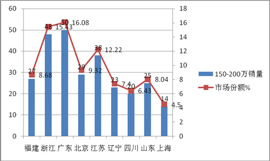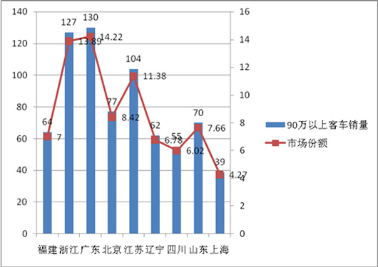1、福建、浙江、广东、北京、江苏等9个区域市场是90万以上高档客车市场的主要需求市场,集中度比较高。需求比例占整个高档客车市场的79.64%,比2014年同期的80.81%降低了近1.17个百分点。也就是说,到其他区域市场销售高端客车只有20%左右的市场机会,比2014年同期提高了近1.2%的市场机会。在90-150万的价格区间,集中度为73.78%,2014年同期为68.96%(同比上升了近4.8个百分点,说明在该细分市场重点区域的垄断程度提高明显,留给其他区域的机会相对增加不多),其他区域的机会只有31%;150-200万的价格区间的集中度为88.1%。而2014年同期为88.79%(同比2015年下降了0.69个百分点,说明在该细分市场重点区域垄断程度有下降不太明显),留给其他区域的机会不到12%;200万以上的集中最高度为98.42%,2014年同期99.02%(同比2015年下降了近0.6个百分点,说明在该细分市场重点区域垄断程度有微弱降低的迹象),留给其他区域的机会只有1.58%。也就是说,90万以上高档客车在价格相对比较低的区间集中度最低,价格越高,集中度越高,进入的区域市场相对就越少。表明价格越低,购买的区域市场越多,价格越高,能够买得起的地区就越少,这很符合客车市场规律,这给国内生产高端客车的客车企业在目标市场定位和制定区域市场营销策略方面都提供了有力的依据。