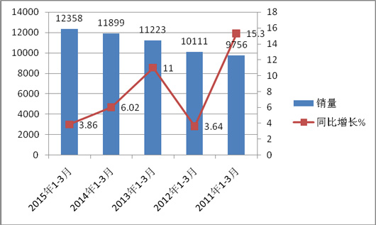 从上图表可以看出:近5年1-3月旅游客车总体趋势是逐年增长,增长最大的是2011年第一季度,达到15.3%,增长最小的是2012年第一季度,只有3.64%,而2015年一季度增幅较2014年同期明显减少,但与最低的2012年比又显得大些,因此说,2015年一季度旅游客车市场总体增长仍然比较平稳。