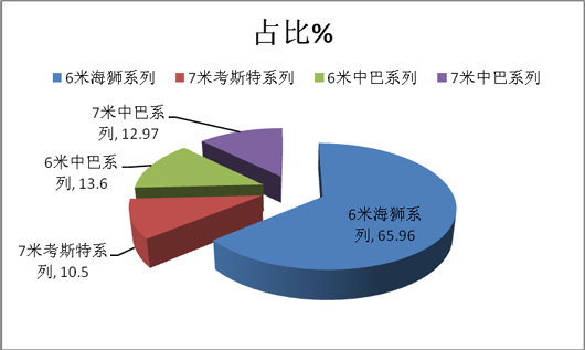 2、6米海狮系列车型占据6-7米旅游客车市场权重最大,达到近66%。