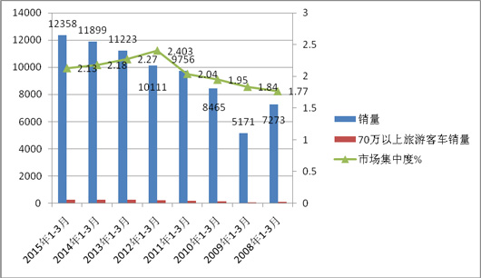 从上图表看出:近7年第一季度70万以上高档旅游客车销量逐步增加,但市场集中度不一定是逐步增加的(在2012年前是逐年增加的,但以后又有逐年减少的迹象),一方面说明高档旅游客车的市场容量越来越大,但与旅游客车总量的扩大并一定成正比例关系。最大也没有达到2.5%,但到2013年第一季度销量虽然在加大,但市场集中度没有延续过去年份的规律继续上升,而是出现了下降,这种规律在2015年继续得到延伸。因此,高档旅游客车产品目前或今后一段时间还不能成为旅游客车市场的主要需求。根据市场调研,70万以上的高端旅游客车目标市场主要是高级旅游观光景区、接待重要贵宾游客等。但该市场被少数厂家垄断。根据调查,我国景区每年的高档用车需求量约为800-1000辆左右,大部分是价格在70万以上的高档旅游车。到目前为止,在九寨沟、长白山、武当山等著名风景区,近几年来共采购价格在70万以上的高档旅游车达数百辆。这基本上被少数企业的旅游观光车所垄断,越是高档的景区,对观光用车的要求越高,顶级景区对观光用车的要求更为苛刻。一般在底盘配置上基本要求是门式桥,进口发动机和进口变速箱,悬挂系统都要带进口气囊,转向系统一般采用进口件,离合器一般采用进口萨克斯,轮胎采用无内胎真空胎.内饰系统一般采用豪华内饰系统,前挡风玻璃采用大曲面的.这是因为高档旅游观光车能从安全、环保、观光等方面满足景区用车的最高标准。2015年1-3月,在12358辆的旅游车销售中,只销售了263辆的高档旅游观光车,占据了近2.13%的市场份额,比去年同期的2.18%下降了近0.05个百分点;说明在我国目前的旅游市场,高档旅游车市场发展速度在加快,但暂时还不能成为旅游市场的主流产品,一方面是因为高档旅游客车的价格太高,一般在70-90万,另一方面高档旅游车的目标用户太窄,只适合等级比较高的旅游景点和少量观光区用车。