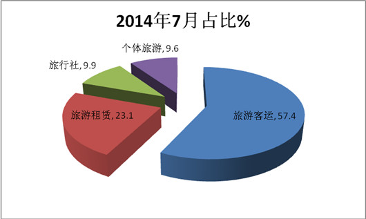 行业 旅游客运 旅游租赁 旅行社 个体旅游 销量(辆) 1679 745 308 260 占比% 56.1 24.9 10.3 8.7 2014年7月占比% 57.4 23.1 9.9 9.6