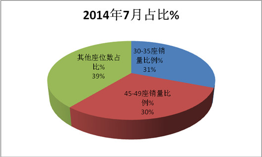 二、7月份中型旅游客车更受到青睐。按座位数划分,2015年7月旅游客车销售数据分析—30-35座及45-49座是销量的主体,45-49座市场集中度下降,30-35座市场集中度上升