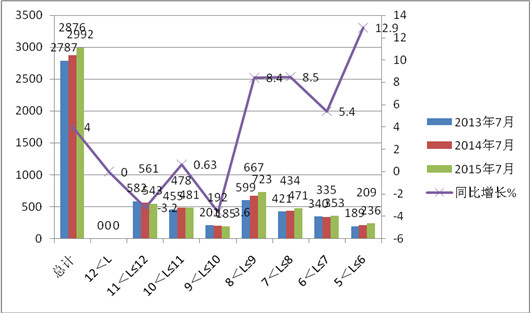 3、2015年7月6-7米轻型客车正增长,2014年7月同比稍微负增长,但总体趋势是向上的,而5-6米轻型客车近3年7月增长一直增长最大,因此可以判断,5-6米旅游客车市场近3年7月增长最大。