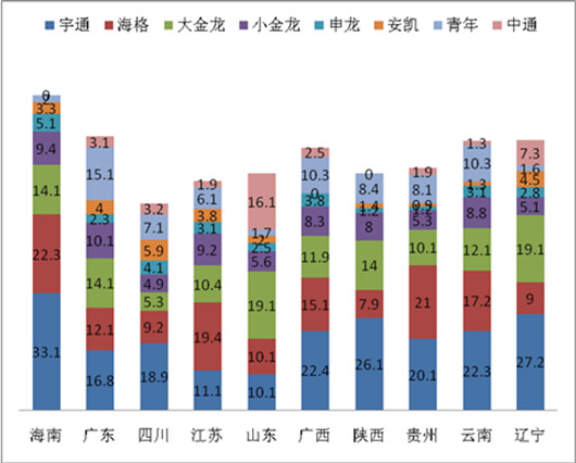 3、上述主流旅游客车企业都有自己的优势市场,如宇通在海南、陕西、云南、贵州、辽宁、广东等区域市场的旅游客车市场份额均超出16%,不愧为中国客车第一品牌;而海格客车在江苏、贵州等地区旅游客车的市场份额较高;大金龙在广东、山东、辽宁等区域市场旅游客车份额较高;以高档客车独领风骚的青年客车在广东、四川、广西等区域市场表现不俗;中通客车在其属地山东区域表现较好。