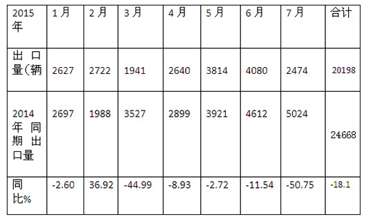 2、2015年1-7月客车行业出口数量为20198辆,同比下降18.1%