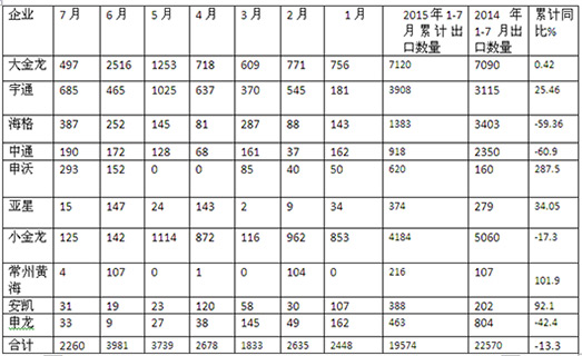根据中国客车统计信息网统计,50家大中客企业2015年7月出口2474辆,同比2015年7月的5024辆下降50.75%,下降幅度之大近年少见,;2015年1-7月出口累计20198辆,2014年同期出口数量为24668辆,同比下降18.1%,下降幅度之大,也是近年少见。
