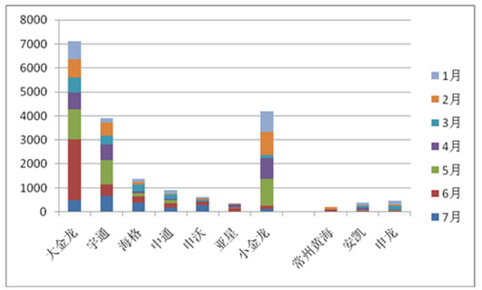 一、2015年1-7月我国50家大中客企业出口数据总结分析